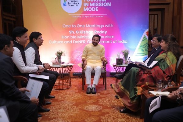 Prominent industry leaders including Mr. Vishal Kamat, Co-Chair, CII WR Sub Committee on Tourism and Hospitality, CEO, Kamat Hotels India Limited, Mr. Anuraag Bhatnagar, CEO, The Leela Palaces, Hotels and Resorts, Cdr Nevil Malao, VSM (Retd), Vice President Head – Cruise & Navy Cell, J. M. Baxi & Co., Mr. Dhimant Bakshi, CEO, Imagica, Mr. Santhosh Kutty, CEO – Hotels, Mahindra Hotels and Resorts one to one interaction with Hon`ble Minister of Tourism, Shri G. Kishan Reddy at the Roadshow in Mumbai.